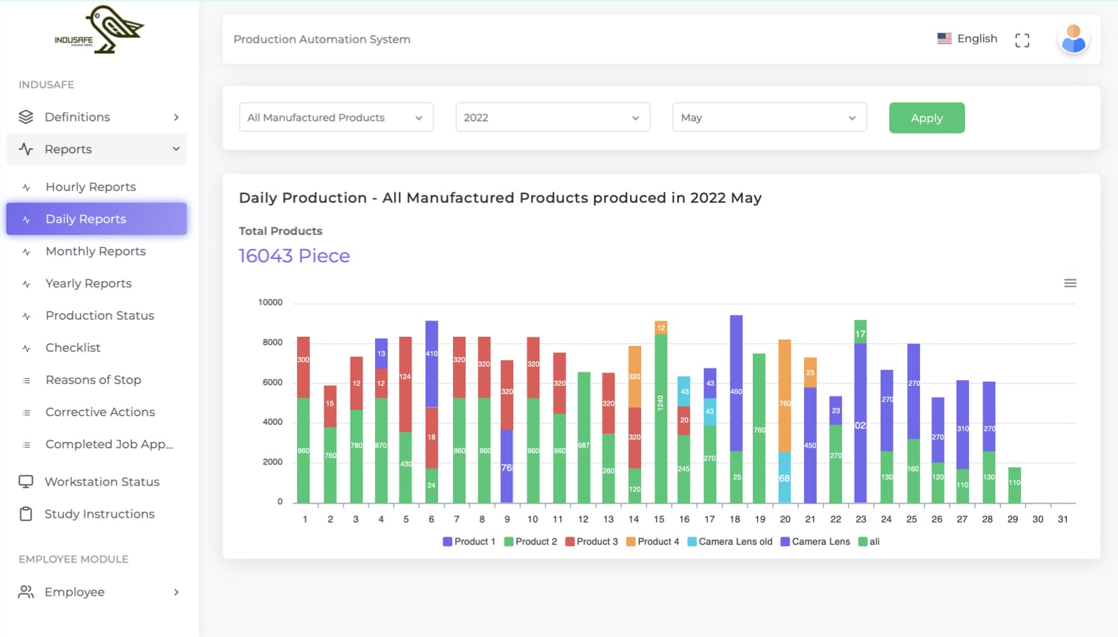Daily, weekly, monthly and yearly reporting of the produced products over the dashboard